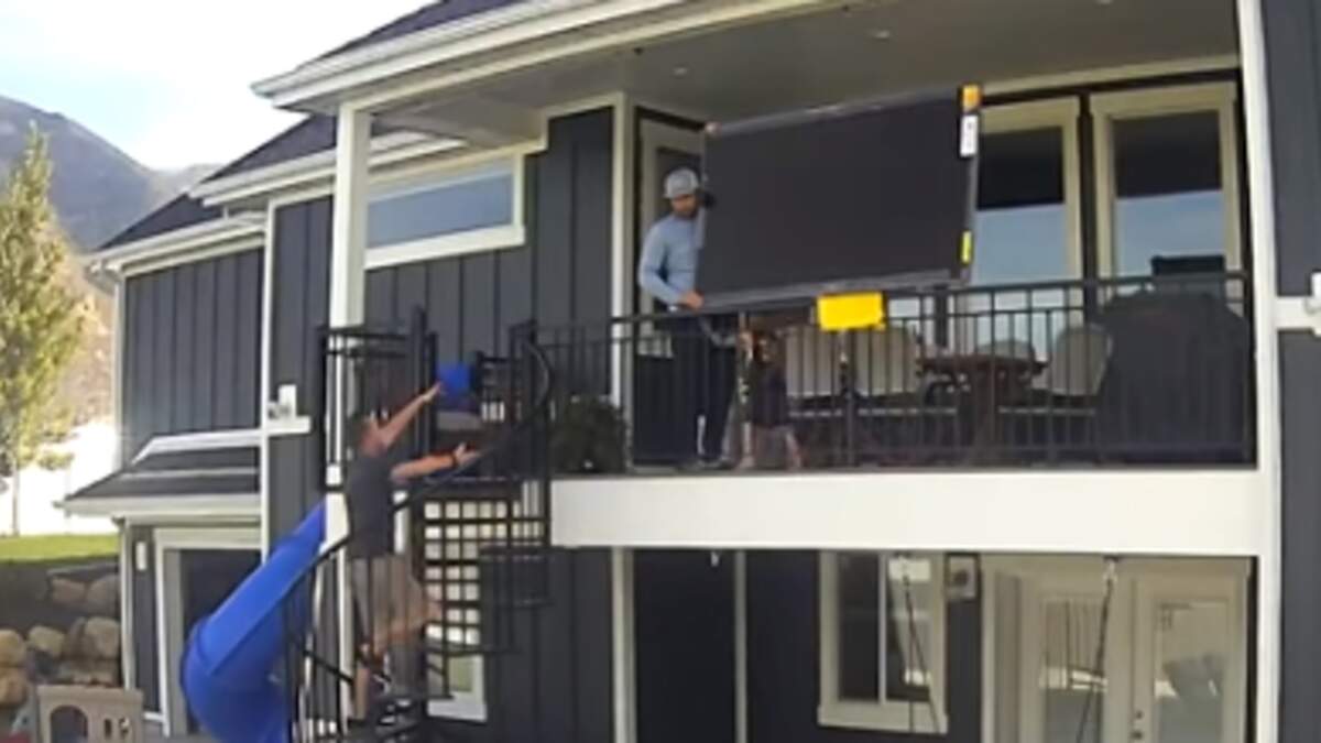 A dad was trying to take a TV down a flight of stairs when out of nowhere his son runs up and sucker punches him in the nuts!
