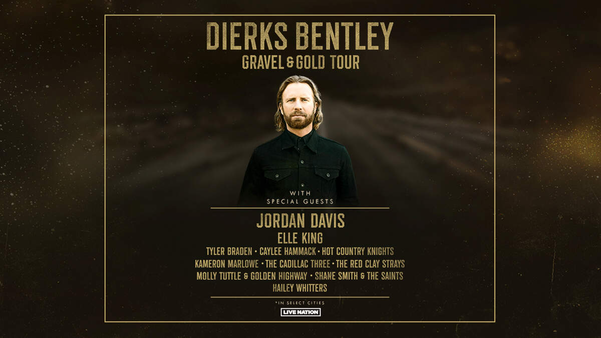 As "an artist made for the outdoor summer concert season” (Sun-Sentinel), multi-Platinum singer/songwriter Dierks Bentley announces details today behind his upcoming GRAVEL & GOLD TOUR this summer, produced by Live Nation. The "notorious road warrior" (Rolling Stone) has tapped Jordan Davis as direct support with a diverse group of special guests joining throughout the 28-city trek including Elle King.