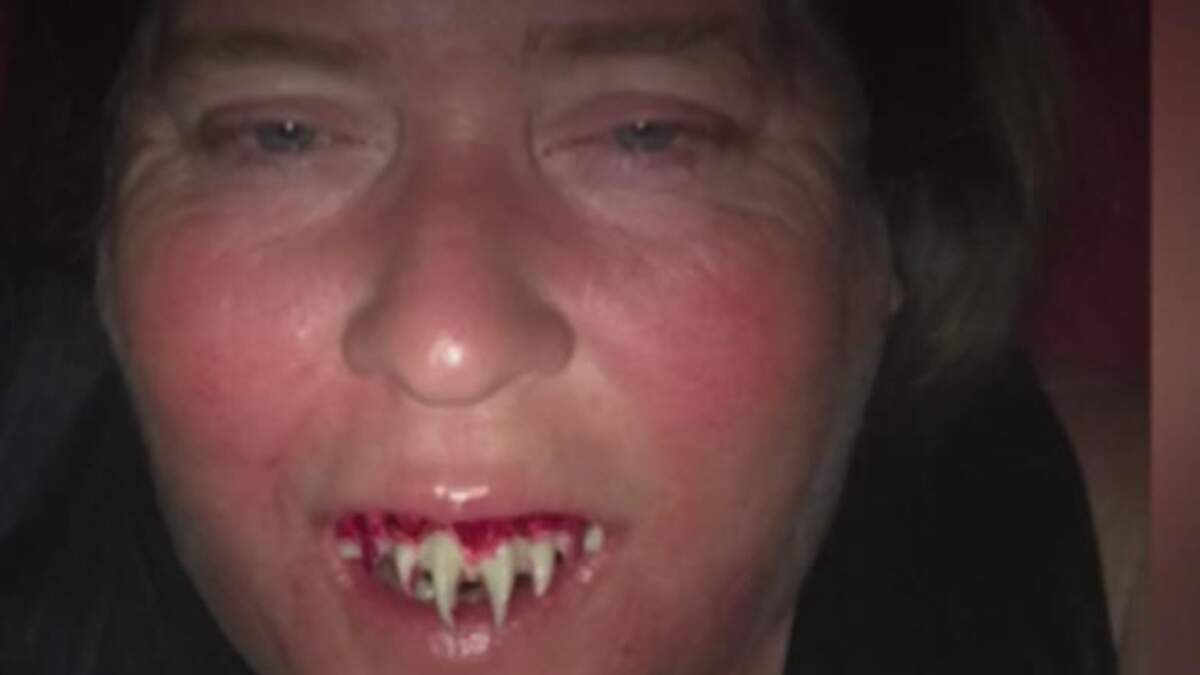 Around 2 a.m Tew returned home and attempted to remove the fake teeth, only to find that they were stuck in her mouth. She used a pair of wire cutters to trim the fangs down but had to go to bed with the fake teeth still glued to her mouth.