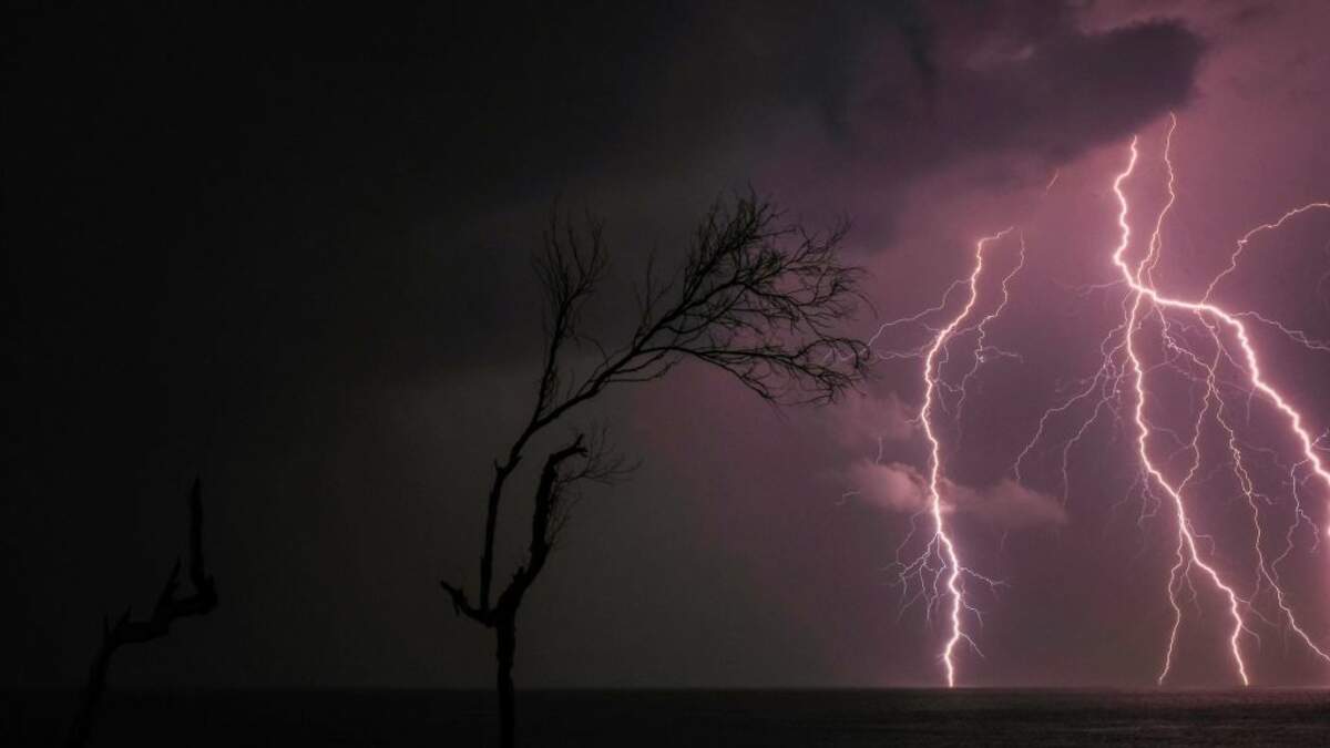 A large evergreen towering outside the building came tumbling down in an instant after being struck by a bolt of lightning, video shows.